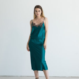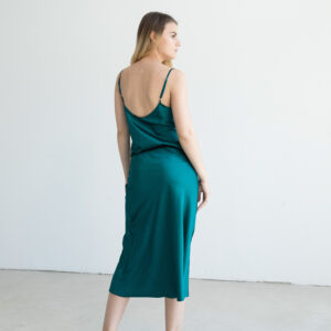 Tesatura catifelata si foarte placuta la atingere. Croi feminin pe bias care avantajeaza silueta, cu elastic fin in talie. Cusaturi ton in ton.