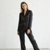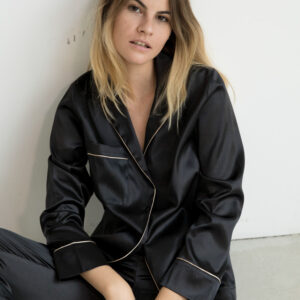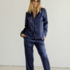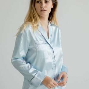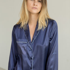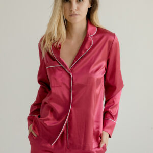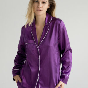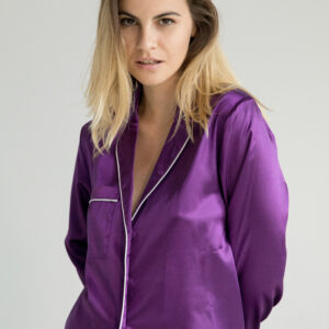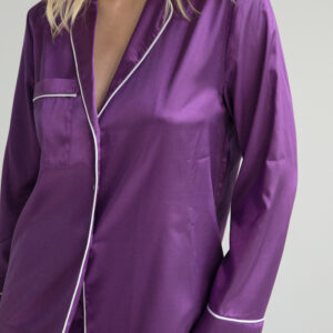 Pijama din satin mov elastic, cu maneca lunga , manseta bordurata cu piping si buzunar personalizabil la cerere si pantalon lung cu buzunare laterale.